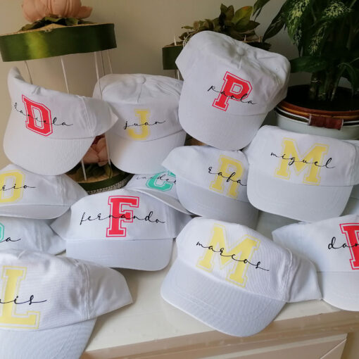 Gorra blanca 100% algodón disponible en 2 tamaños, junior y adulto. Personalizadas con inicial de colores surtido, o todas iguales, como prefieras. Son lavables y serán un regalo acertadísimo para tus eventos.