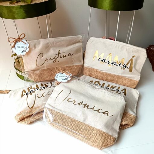 Neceser de algodón combinado con yute de 20×16 cm. con gran capacidad, personalizado con nombre dorado.