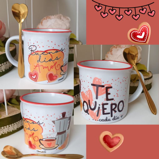 Taza, BUENOS DIAS AMOR, con cuchara dorada de corazon